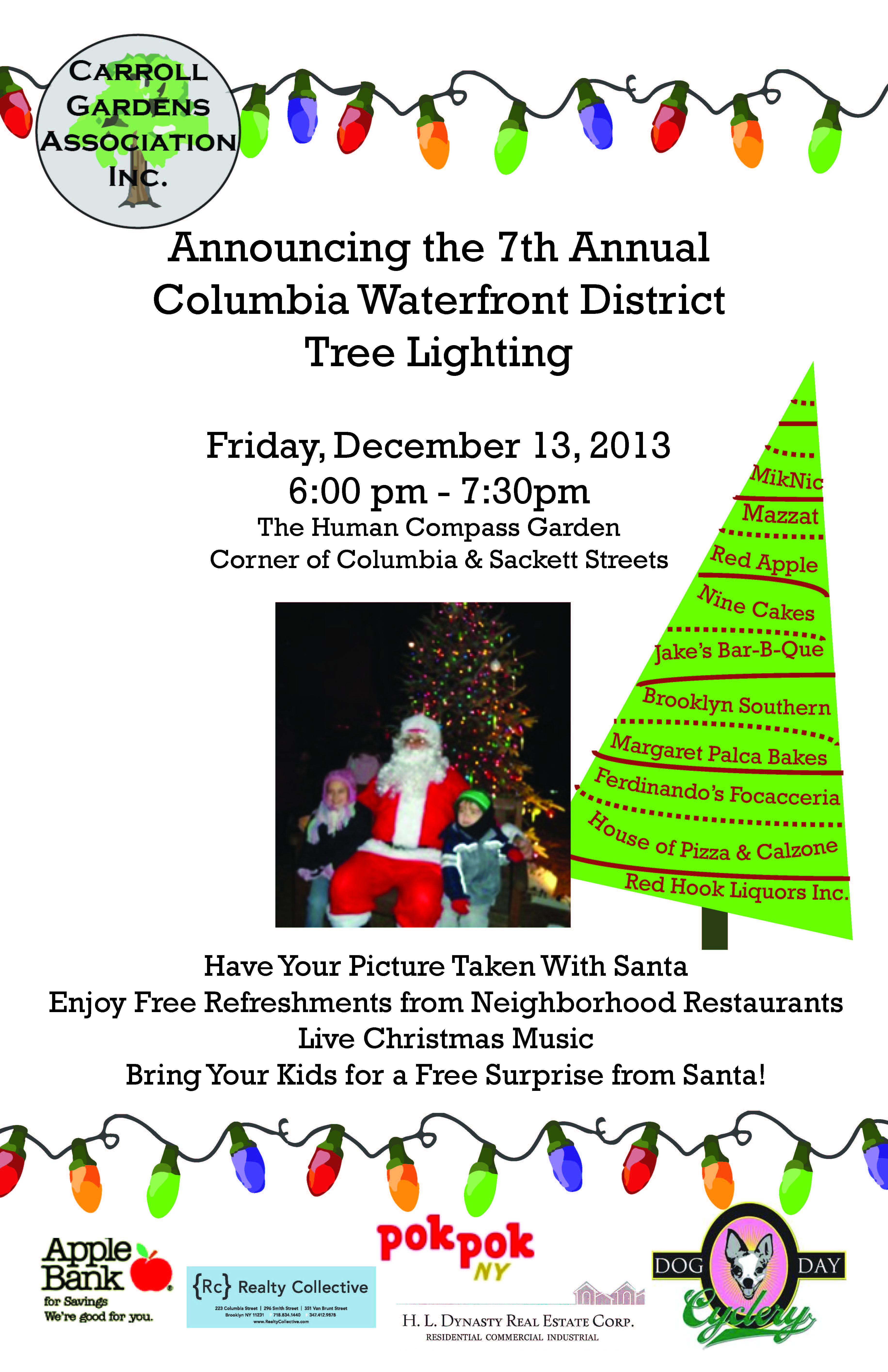 Join us for the 7th Annual Columbia Waterfront District Tree Lighting on Friday, December 13th from 6pm to 7:30pm at the Human Compass Garden (Columbia & Sackett Streets). Dan Kurfirst Trio will perform holiday music; there will be free refreshments compliments of local restaurants; and Santa will arrive on the FDNY Local 202 truck with surprises for children.
