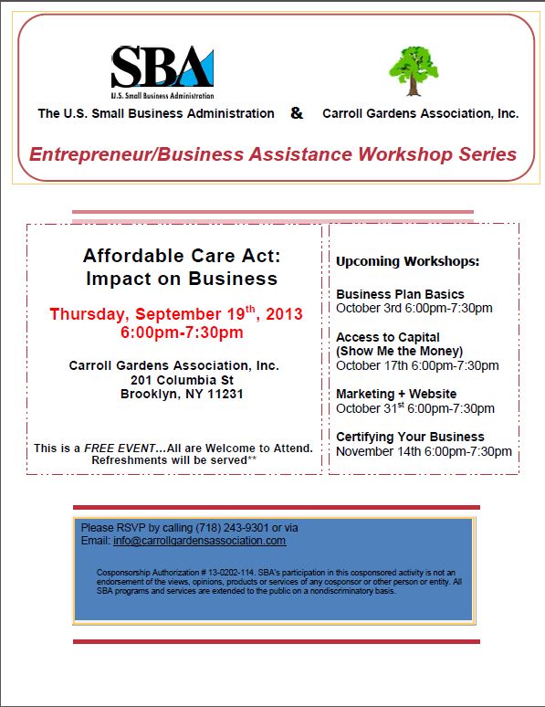 Affordable Care Act Informational to be held Thursday, September 19th, 2013 here at the CGA Offices! RSVP today by writing to info@carrollgardensassociation.com! Share this:FacebookTwitterLinkedInTumblrPinterest September 16th, 2013 Posted in News and Events