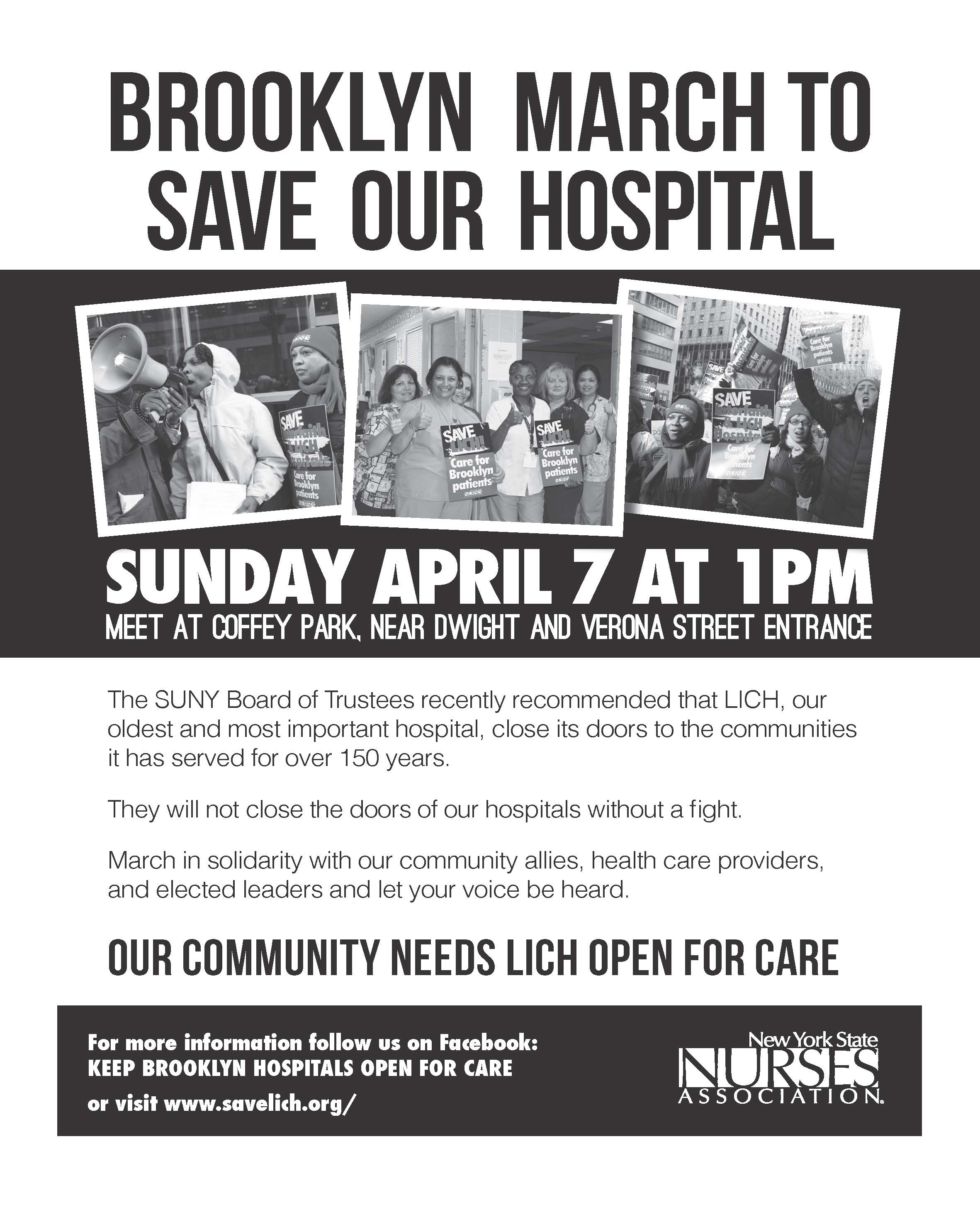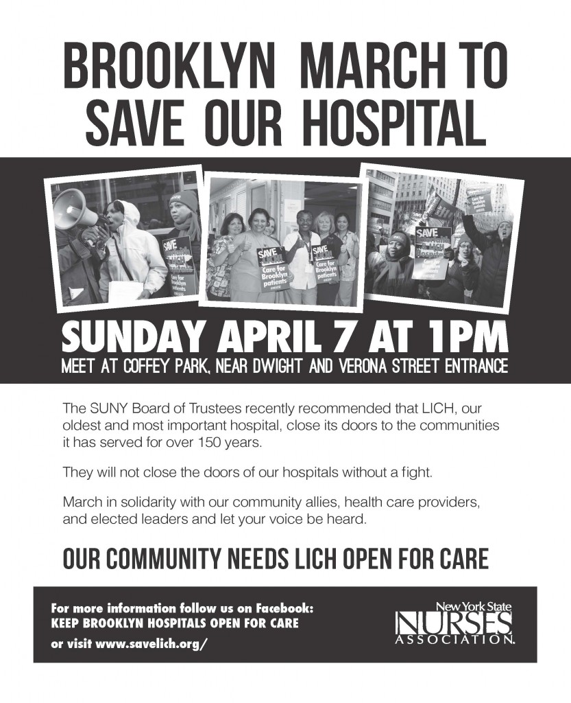 The Brooklyn March to Save Our Hospital: The march starts at 1:00 p.m., Sunday, April 7th, 2013 at Coffey Park in Red Hook (between Dwight and Verona Streets). Join the march that will wind through South Brooklyn neighborhoods and will end at Long Island College Hospital. Show your support and bring your family and friends as our community, health care providers, and elected leaders demonstrate the importance of LICH to all of us. Contact CGA Community Organizer Katie Wauchope at (718) 243-9301 if you need more posters and other materials to distribute throughout the community.