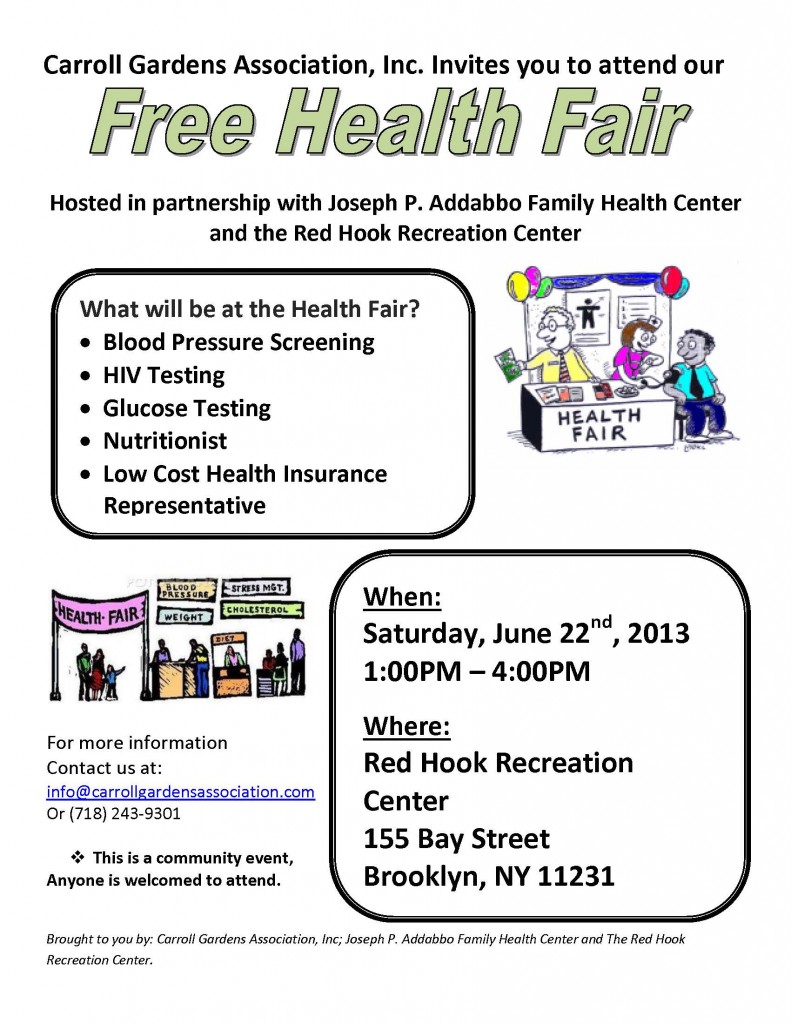 Carroll Gardens Association, Inc. (CGA) is hosting a Free Health Fair on Saturday, June 22nd, 2013 from 1:00 p.m. – 4:00 p.m. at the Red Hook Recreation Center, located at 155 Bay Street. The Health Fair is being conducted in partnership with the Joseph P. Addabbo Family Health Center and the Red Hook Recreation Center. During the Health Fair, the following free services will be offered: