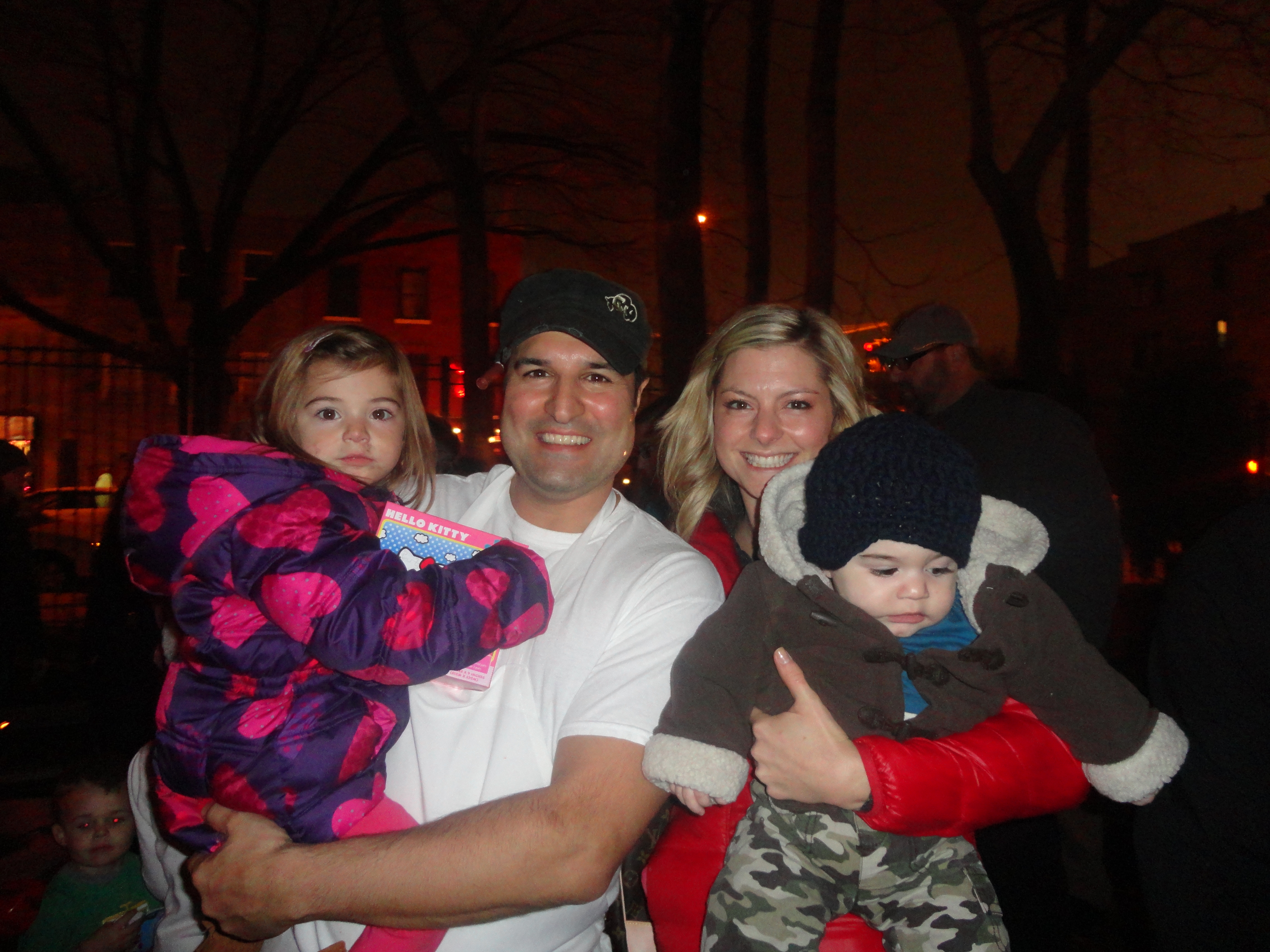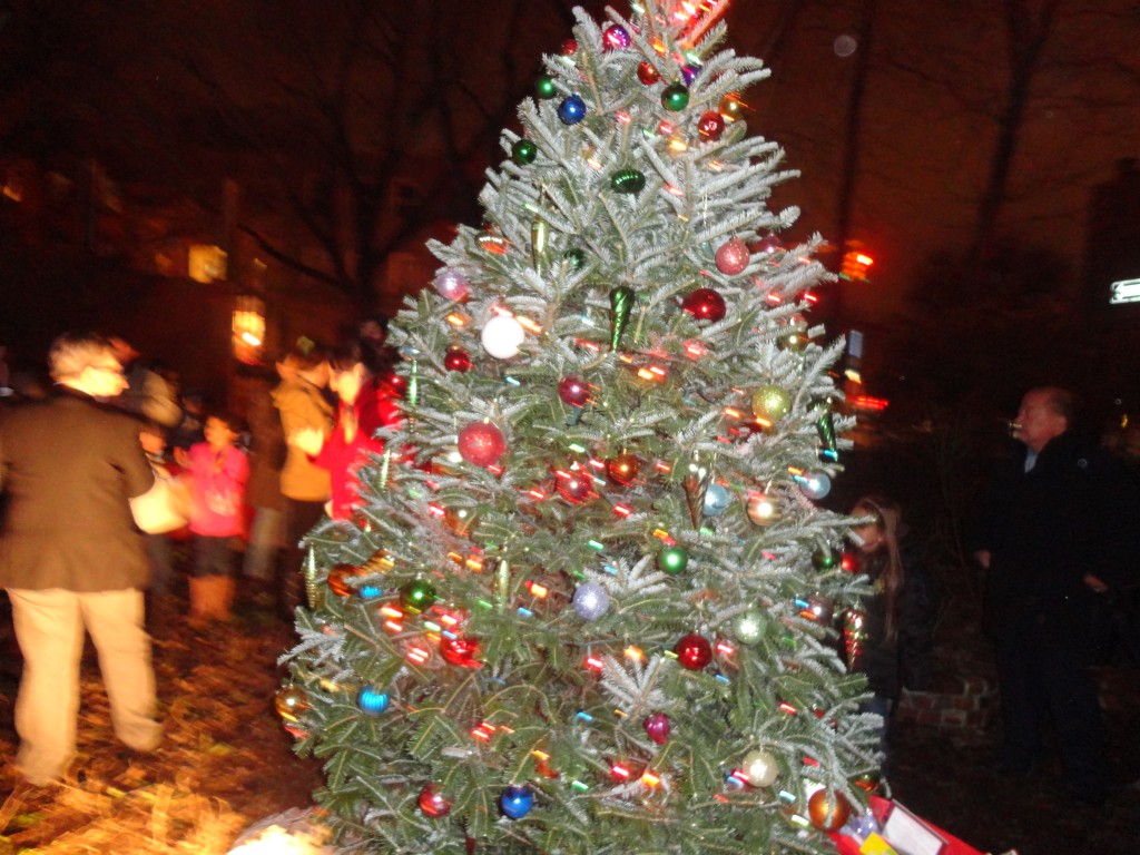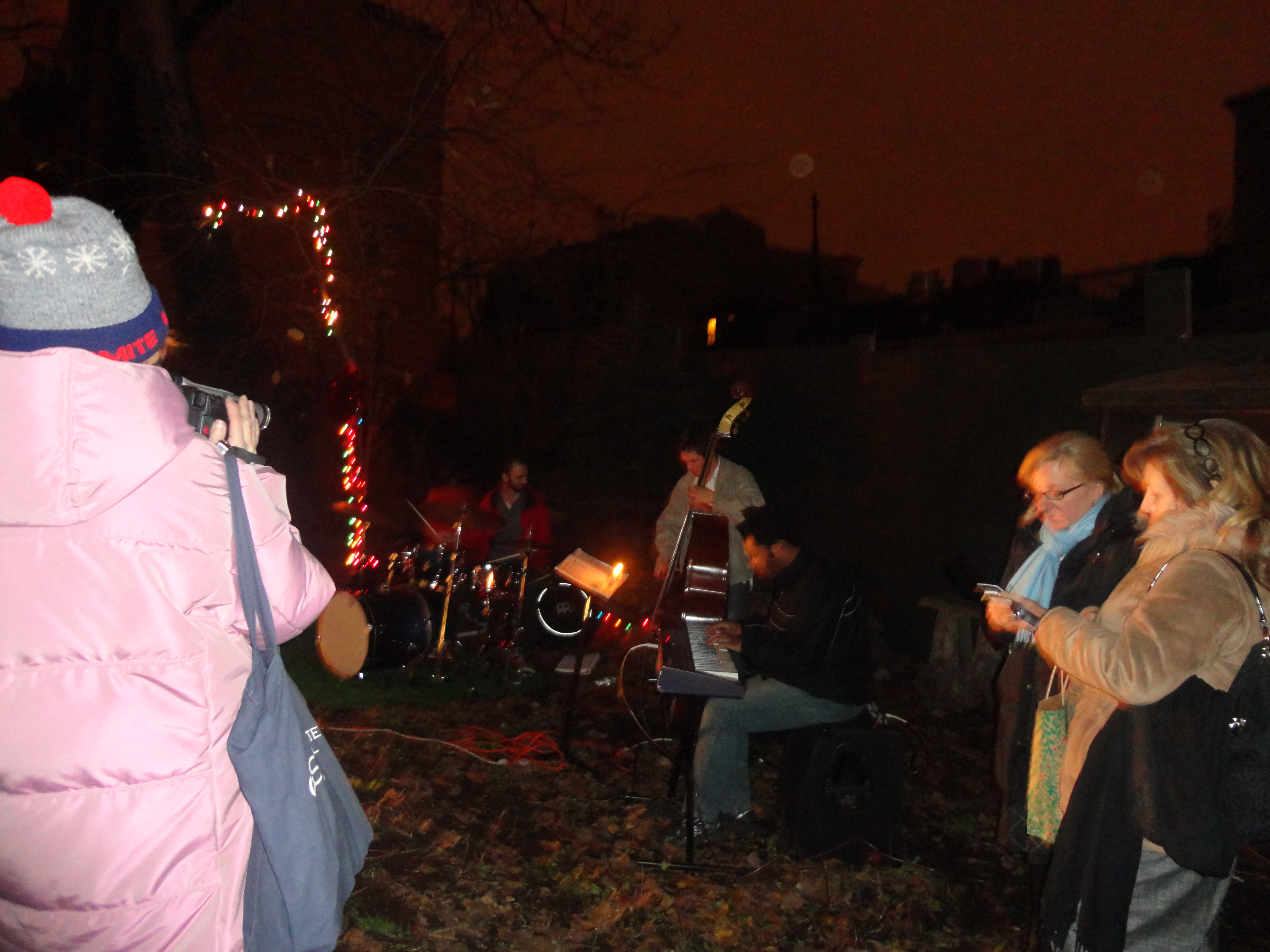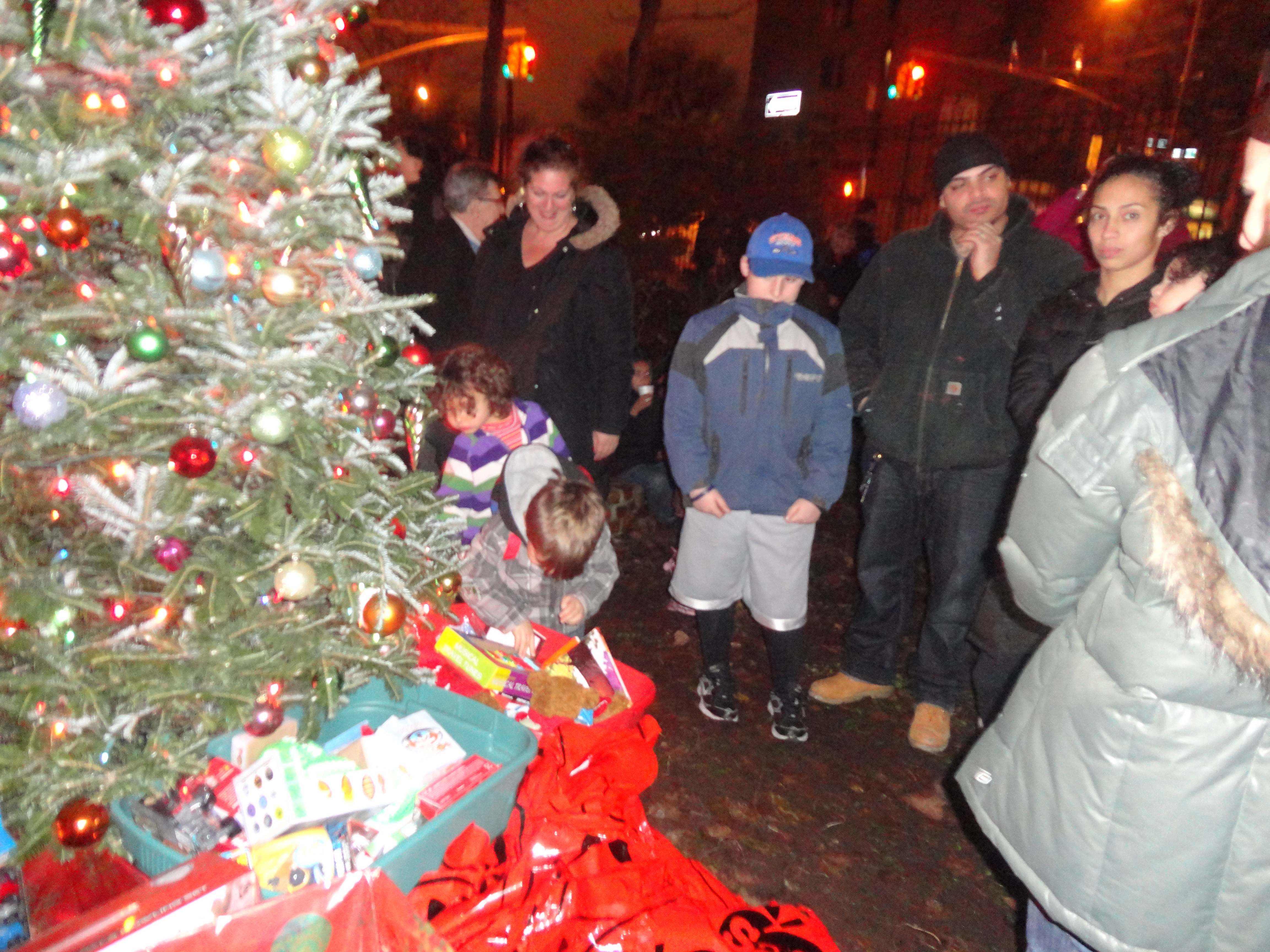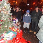 Over 200 people gathered to celebrate the Holiday Season at the 5th Annual Columbia Waterfront Tree Lighting Ceremony held at the Human Compass Garden on December 9th, 2011. This year’s tree lighting ceremony was jointly sponsored by Carroll Gardens Association, Inc., the Columbia Waterfront District Merchants Association, Apple Bank, the Red Hook Star-Revue, and the House of Pizza & Calzone. Congresswoman Nydia Velasquez and State Senator Daniel Squadron gave their holiday greetings and urged community residents to patronize local businesses. Representatives from other elected officials were also present during the event. More than 100 children waited anxiously for Santa to arrive, while the Less Magnetic Band entertained the crowd with their Holiday Jazz repertoire. After some delay, Santa finally made his appearance in a fire truck, welcomed by the adulation of screaming little voices. The evening was capped with Santa and his helpers handing out toys to happy little youngsters.