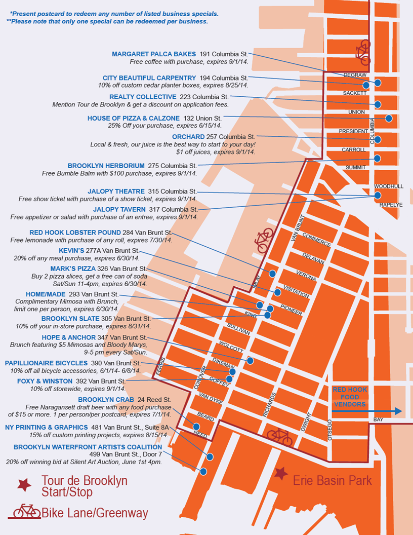 To celebrate the Tour de Brooklyn, SBIDC, Carroll Gardens Association, and Restore Red Hook teamed up to promote the local businesses in Red Hook and the Columbia Waterfront District. Residents, visitors, and bicyclists alike can take advantage of these limited time specials at area businesses.