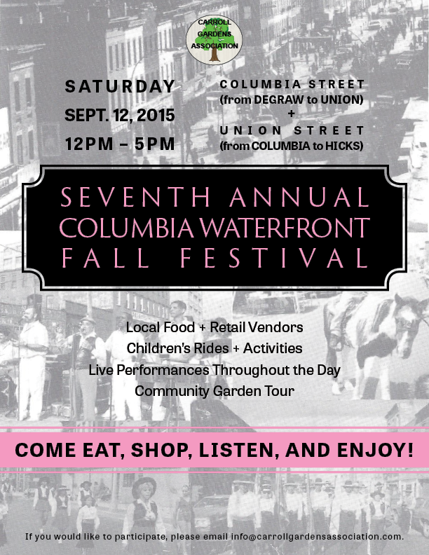 The Seventh Annual Columbia Waterfront Fall Festival will be held on Saturday, September 12, 2015 from 12 PM – 5 PM on Columbia Street (between DeGraw and Union Street) & Union Street (between Columbia and Hicks Street).